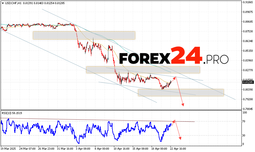 USDCHF Forecast Dollar Franc for April 23, 2025 suggests an attempt to develop a bullish correction and test the resistance area near the level of 0.8165. Further, the continuation of the fall of the USD/CHF currency pair with a target below the level of 0.7865. An additional signal in favor of a decline in the Dollar Franc pair will be a rebound from the trend line on the relative strength indicator. The cancellation of the fall option will be a strong growth and a breakout of the 0.8255 area. This will indicate a breakout of the resistance level and continued growth of the pair with a potential target above the 0.8465 level.