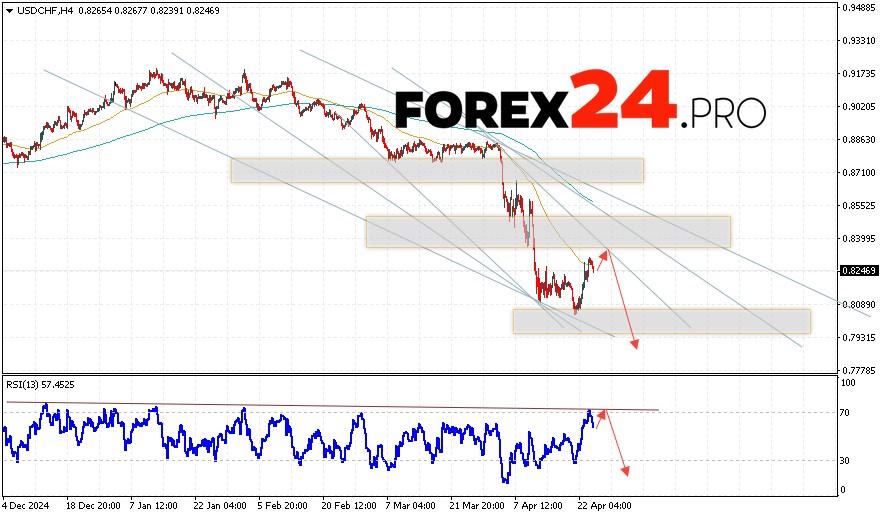 USDCHF Forecast Dollar Franc for April 25, 2025 suggests an attempt to develop a bullish correction and test the resistance area near the 0.8305 level. Further, the continuation of the fall of the USD/CHF currency pair with a target below the 0.7925 level. An additional signal in favor of a decline in the Dollar Franc pair will be a rebound from the trend line on the relative strength indicator. The cancellation of the fall option will be a strong growth and a breakout of the 0.8465 area. This will indicate a breakout of the resistance level and continued growth of the pair with a potential target above the 0.8675 level.