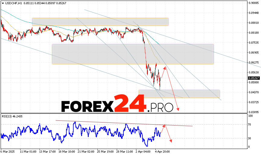 USDCHF Forecast Dollar Franc for April 8, 2025 suggests an attempt to develop a bullish correction and test the resistance area near the 0.8585 level. Further, the continuation of the fall of the USD/CHF currency pair with a target below the 0.8325 level. An additional signal in favor of the decline of the Dollar Franc pair will be a rebound from the trend line on the relative strength indicator. The cancellation of the scenario with the fall will be a strong growth and a breakout of the 0.8645 area. This will indicate a breakout of the resistance level and continued growth of the pair with a potential target above the level of 0.8855.
