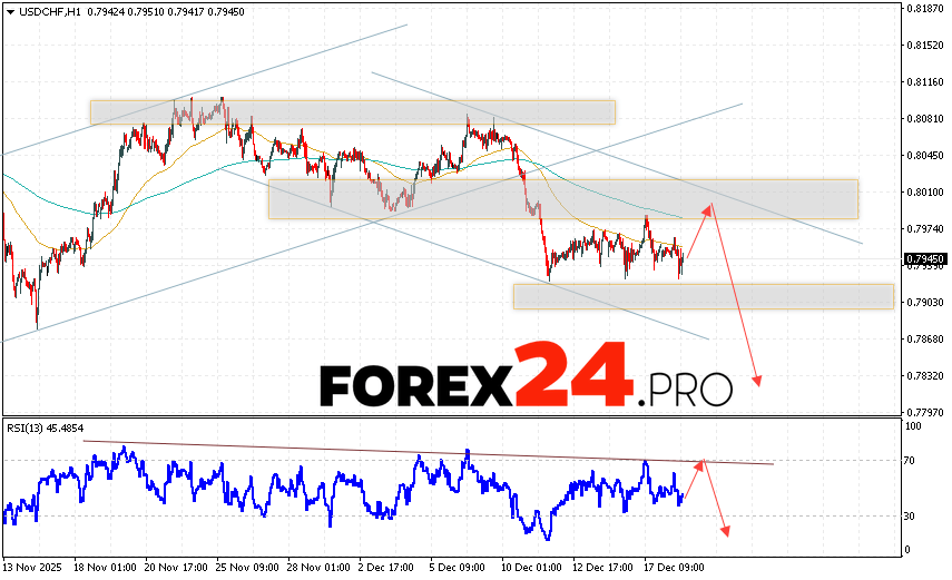 USDCHF Forecast Dollar Franc for December 19, 2025 suggests an attempt to develop a bullish correction and test the resistance area near 0.7995. Subsequently, the USD/CHF currency pair is expected to continue to decline, with a target below 0.7825. A rebound from the trend line on the relative strength indicator (RSI) would be an additional signal for a decline in the USD/CHF pair. A strong rally and a breakout of 0.8055 would cancel out the downside scenario. This would indicate a breakout of the resistance level and continued growth, with a potential target above 0.8205.