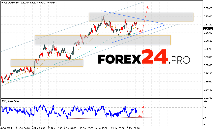 USDCHF Forecast Dollar Franc for February 14, 2025 suggests an attempt to develop the decline and test the support area near the level of 0.9035. Further, the continuation of the growth of the USD/CHF currency pair with a target above the level of 0.9285. An additional signal in favor of the rise of the Dollar Franc pair will be a rebound from the trend line on the relative strength indicator. The cancellation of the growth option will be a fall and a breakout of the 0.8965 area. This will indicate a breakout of the support level and a continuation of the fall of the pair with a potential target below the level of 0.8745.