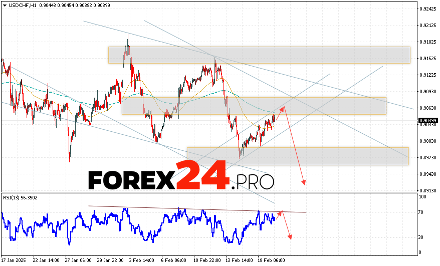 USDCHF Forecast Dollar Franc for February 20, 2025 suggests an attempt to develop the development of the rise and test the resistance area near the level of 0.9065. Next, the USD/CHF currency pair will continue to fall with a target below 0.8875. An additional signal in favor of a decline in the Dollar/Franc pair will be a rebound from the trend line on the relative strength indicator. The cancellation of the fall option will be a strong growth and a breakout of the 0.9095 area. This will indicate a breakout of the resistance level and continued growth of the pair with a potential target above 0.9215.