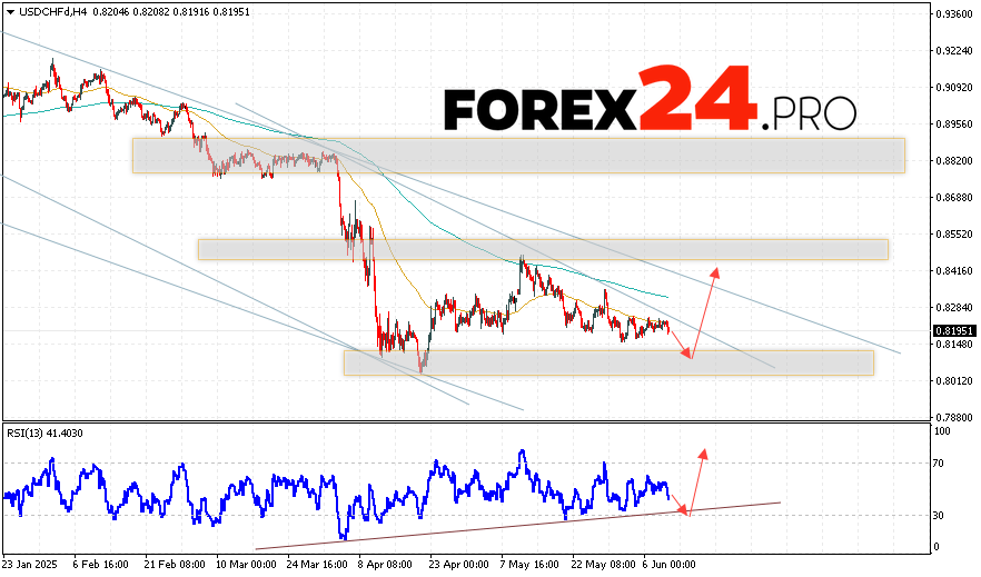 USD/CHF Forecast Dollar Franc for June 12, 2025 suggests an attempt to develop a decline and test the support area near the 0.8135 level. Further, the USD/CHF currency pair will continue to grow with a target above the 0.8415 level. An additional signal in favor of the rise of the Dollar-Franc pair will be a rebound from the trend line on the relative strength indicator. A strong growth and a breakout of the 0.8005 area will cancel the decline scenario. This will indicate a breakout of the support level and a continuation of the pair’s decline with a potential target below the 0.7825 level.