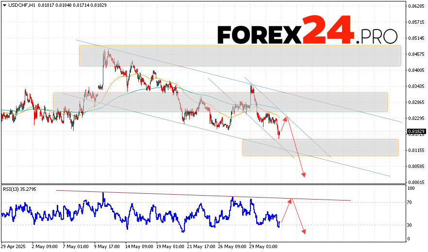 USD/CHF Forecast Dollar Franc for June 3, 2025 anticipates an attempt to develop a bullish correction and test the resistance area near the level of 0.8230. Next, continuation of the USD/CHF currency pair’s decline with a target below the level of 0.8035. An additional signal in favor of decreasing the Frank Dollar pair will be a bounce off the trend line on the Relative Strength Index (RSI) indicator. Cancellation of the downside option will be a strong rise and breakout through the area of 0.8365. This will indicate breaking resistance level and continuation of the pair’s growth with potential target above the level of 0.8605.