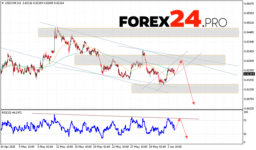 USD/CHF Forecast Dollar Franc for June 5, 2025 anticipates an attempt at developing a bullish correction and testing the resistance area close to the level of 0.8285. Following that, further decline in the USD/CHF currency pair with a target below the level of 0.8055. An additional signal for the depreciation of the Dollar Franc pair would be a bounce off the trend line on the Relative Strength Index (RSI) indicator. Cancellation of the downside scenario will occur if there is strong growth and a breakthrough the area of 0.8365. This will indicate a breakthrough the resistance level and continuation of the rise in the currency pair with a potential target above the level of 0.8645.