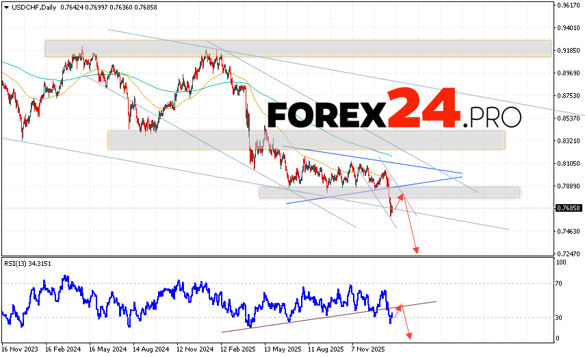 USDCHF Weekly Forecast February 2 – 6, 2026 suggests an attempt to develop a bullish correction and a test of the resistance level near the 0.7765 area. Subsequently, the USD/CHF pair should continue to decline below 0.7245. A test of the trend line on the relative strength indicator (RSI) would support a decline. The USD/CHF downside scenario would be cancelled if the pair breaks the resistance area and closes above 0.8175. This would indicate continued upside with a potential target above 0.8475.