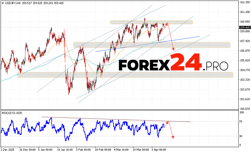 USD/JPY Forecast Japanese Yen for April 14, 2026 suggests an attempt to develop a bullish correction with a test of the resistance zone near 159.85. Then, the bearish momentum in quotes will continue to develop below 156.85. A test of the trendline on the relative strength indicator (RSI) will favor a decline. A strong rally and a breakout of 160.35 will cancel out this downward scenario. This will indicate a breakout of the resistance level and continued growth with a potential target above 162.05.