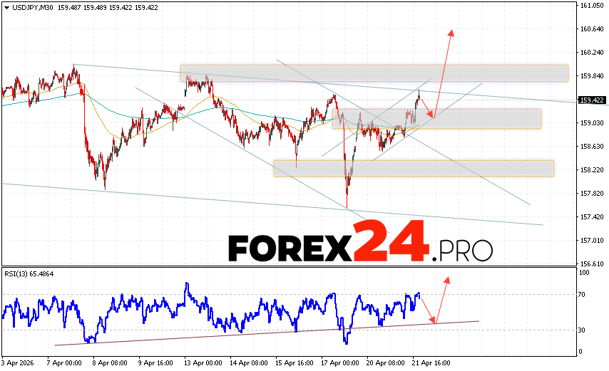 USD/JPY Forecast Japanese Yen for April 22, 2026 suggests an attempt to develop a bearish correction with a test of the support zone near 158.95. Then, the bullish momentum in quotes will continue to develop above 160.65. A test of the trendline on the relative strength indicator (RSI) would support the pair’s growth. A decline in prices and a breakout of the 158.75 level would invalidate the upward trend. This would signal a breakout of the support level and a continued decline, with a potential target below 156.45.