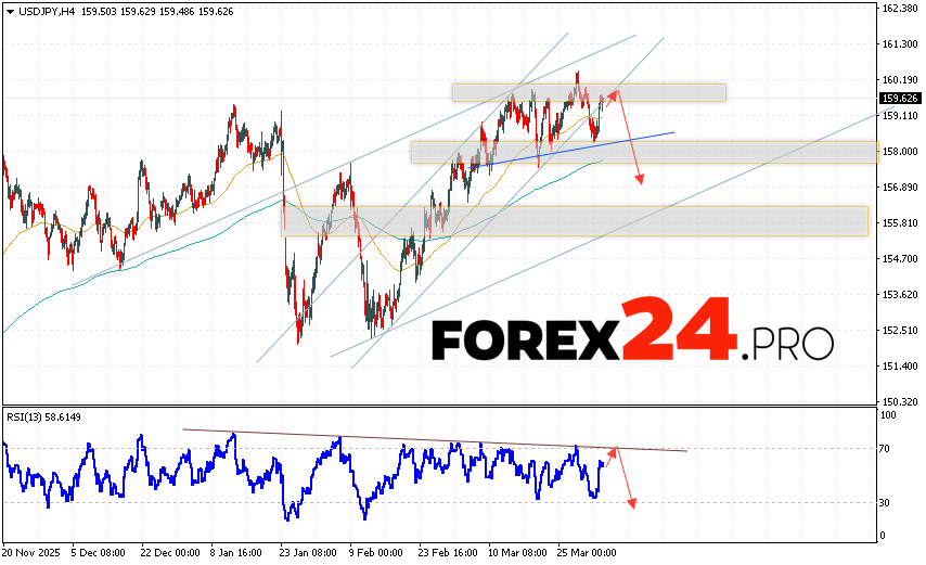 USD/JPY Forecast Japanese Yen for April 3, 2026 suggests an attempt to develop a bullish correction with a test of the resistance zone near 159.95. Then, the bearish momentum in quotes will continue to develop below 156.95. A test of the trendline on the relative strength indicator (RSI) will favor a decline. A strong rally and a breakout of 160.85 will cancel out this downward scenario. This will indicate a breakout of the resistance level and continued growth with a potential target above 162.95.