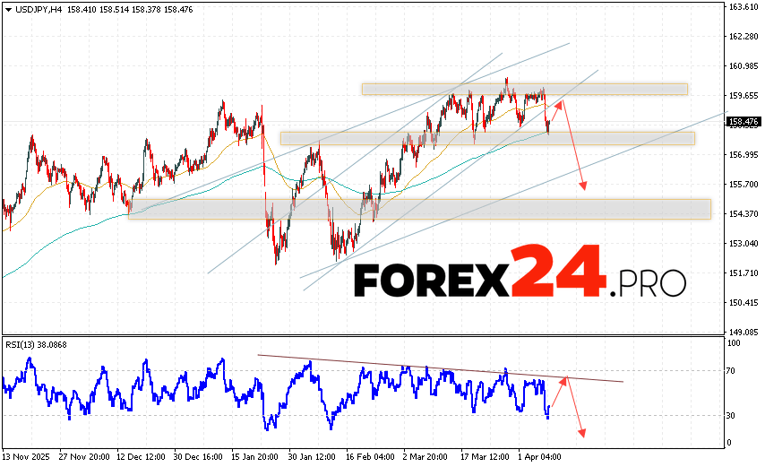 USD/JPY Forecast Japanese Yen for April 9, 2026 suggests an attempt to develop a bullish correction with a test of the resistance zone near 159.65. Then, a continuation of the bearish momentum in quotes to the area below 155.45. A test of the trend line on the RSI would support a decline in the pair. A strong rally and a breakout of the 160.85 level would cancel out the downside scenario. This would indicate a breakout of the resistance level and continued growth of the pair, with a potential target above 161.75.