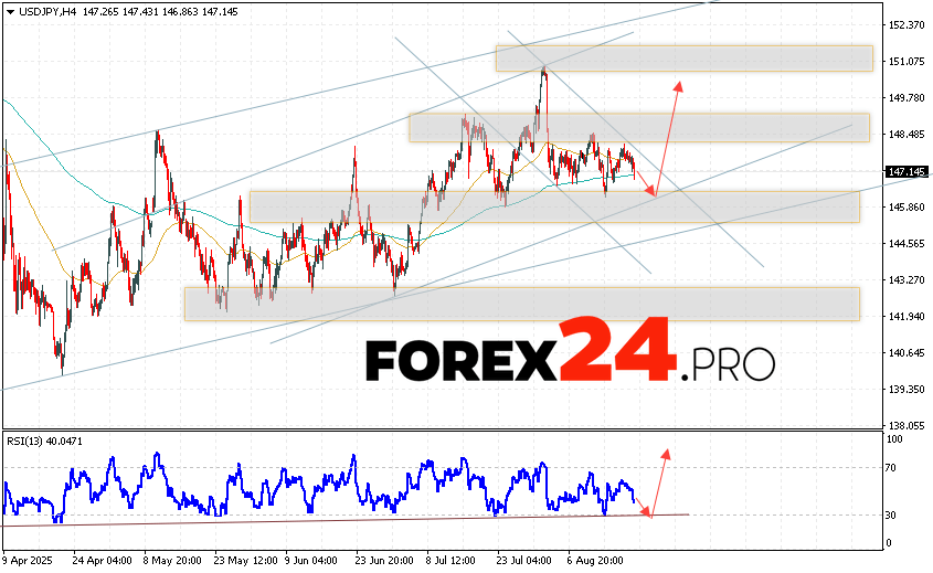 USDJPY Forecast Japanese Yen for August 21, 2025 suggests an attempt to develop a correction with a test of the support zone near the level of 145.95. Then, the continuation of the development of the bullish impulse of quotes to the area above the 150.85 mark. The test of the trend line on the relative strength indicator will be in favor of the growth of the pair. The cancellation of the growth option will be a drop in quotes and a breakout of the 144.85 area. This will indicate a breakout of the support level and a continuation of the fall of the pair with a potential target below the level of 143.25.