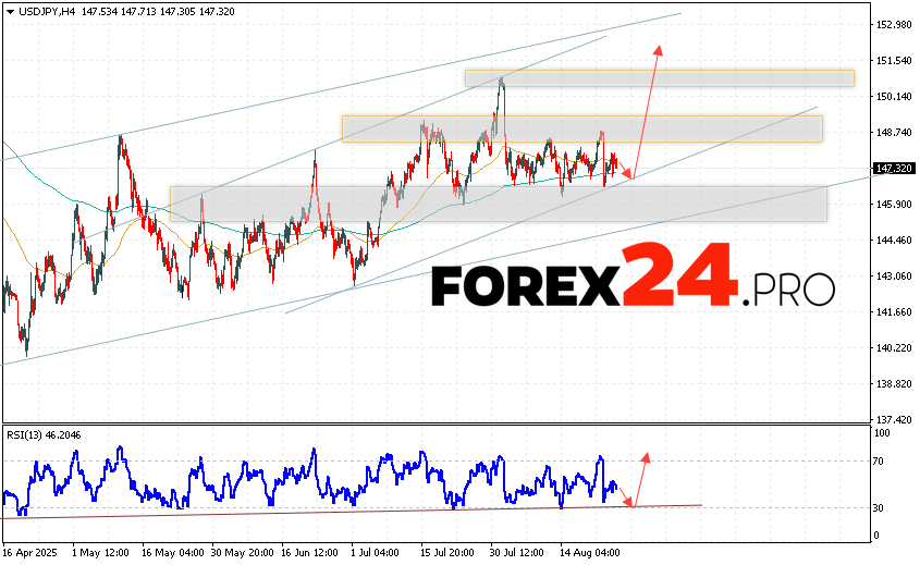 USD/JPY Forecast Japanese Yen for August 27, 2025 suggests an attempt to develop a correction with a test of the support zone near the level of 147.05. Then, the continuation of the development of the bullish impulse of quotes to the area above the 151.45 mark. The test of the trend line on the relative strength indicator will be in favor of the growth of the pair. The cancellation of the growth option will be a drop in quotes and a breakout of the 145.25 area. This will indicate a breakout of the support level and a continuation of the fall of the pair with a potential target below the level of 143.15.