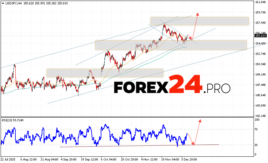 USD/JPY Forecast Japanese Yen for December 9, 2025, suggests an attempt at a bearish correction with a test of the support zone near 154.75. Then, the bullish momentum in quotes will continue to develop above 159.75. A test of the trend line on the relative strength indicator (RSI) would support the pair’s upside. A decline in quotes and a breakout of 153.25 would cancel out the upward trend. This would indicate a breakout of the support level and a continued decline in the pair with a potential target below 151.25.