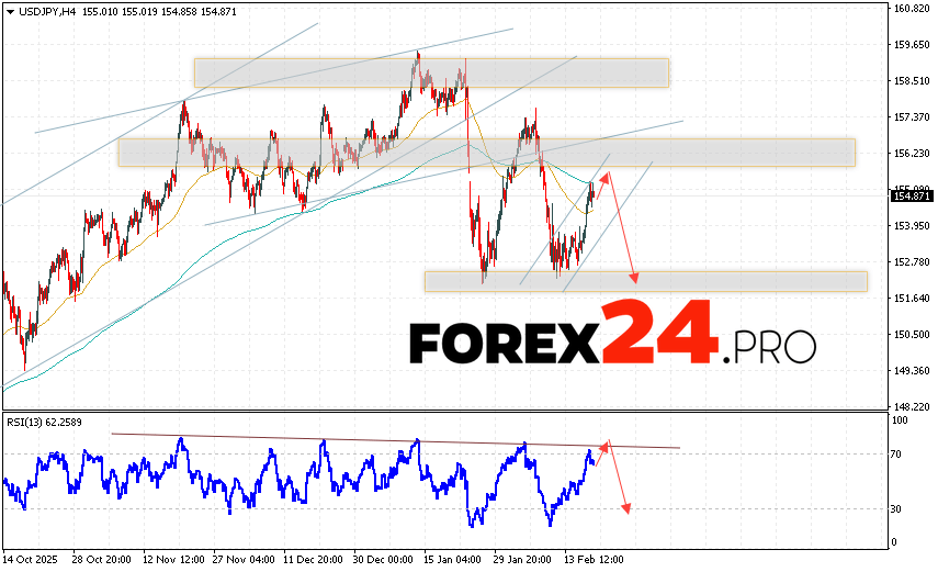 USD/JPY Forecast Japanese Yen for February 20, 2026 suggests an attempt at a bullish correction, testing the resistance zone near 155.25. Subsequently, the bearish momentum will continue to develop below 152.25. A test of the trendline on the relative strength indicator (RSI) would support a decline. A strong rally and a breakout of 156.35 would invalidate the bearish scenario. This would signal a breakout of the resistance level and continued growth with a potential target above 158.95.