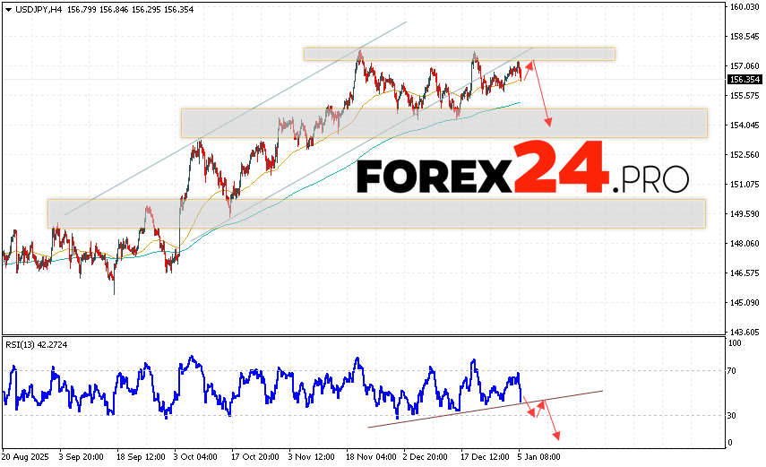 USD/JPY Forecast Japanese Yen for January 6, 2026 suggests an attempt to develop a bullish correction with a test of the resistance zone near 157.25. Then, the bearish momentum in quotes will continue to develop below 154.05. A test of the trend line on the relative strength indicator (RSI) would support a decline in the pair. A strong rise in quotes and a breakout of the 158.75 level would cancel the downside scenario. This would indicate a breakout of the resistance level and continued growth of the pair, with a potential target above 160.45.
