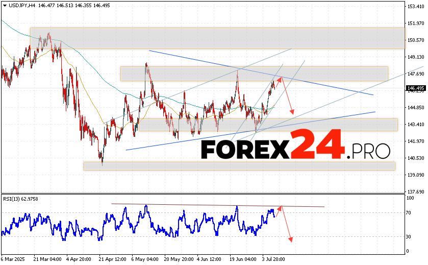 USD/JPY Forecast Japanese Yen for July 10, 2025 suggests an attempt to develop a bullish correction with a test of the resistance zone near the 147.25 level. Then, the bearish momentum of quotes will continue to develop in the area below the 144.65 mark. A test of the trend line on the relative strength indicator will support the pair’s decline. A strong rise in quotes and a breakout of the 149.45 area will cancel the decline scenario. This will indicate a breakout of the resistance level and a continuation of the pair’s growth with a potential target above the 151.65 level.