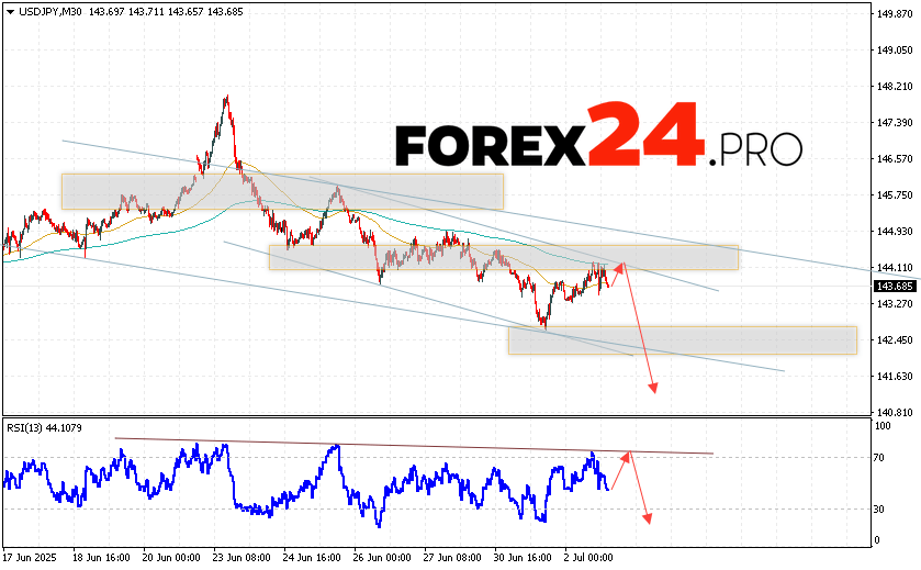 USD/JPY Forecast Japanese Yen for July 3, 2025 suggests an attempt at a bullish correction with a test of the resistance zone near the 144.05 level. Then, the bearish momentum of the quotes will continue to develop in the area below the 141.45 mark. A test of the trend line on the relative strength indicator will support the pair’s decline. A strong rise in quotes and a breakout of the 145.05 area will cancel the decline scenario. This will indicate a breakout of the resistance level and a continuation of the pair’s growth with a potential target above the 147.35 level.