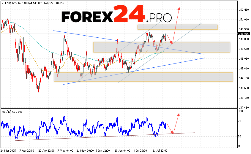 USD/JPY Forecast Japanese Yen for July 31, 2025 suggests an attempt at a bearish correction with a test of the support zone near the 147.85 level. Then, the bullish momentum of quotes will continue to develop in the area above the 152.45 mark. The test of the trend line on the relative strength indicator will support the growth of the pair. A decline in quotes and a breakout of the 146.05 area will cancel the rise scenario. This will indicate a breakout of the support level and a continuation of the pair’s decline with a potential target below 144.75.
