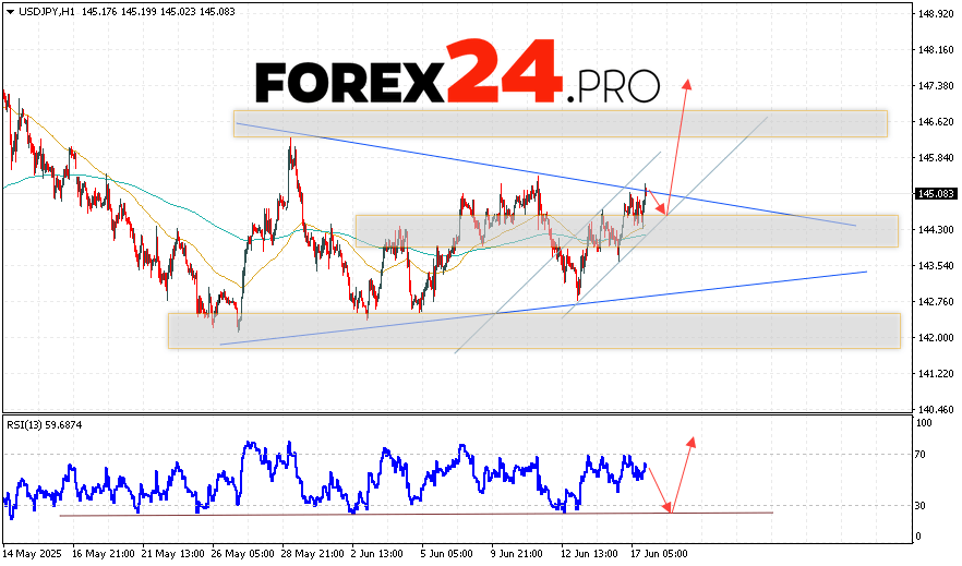 USD/JPY Forecast Japanese Yen for June 18, 2025 suggests an attempt to develop a bearish correction with a test of the resistance zone near the 144.55 level. Then, the bullish momentum of quotes will continue to develop in the area above the 147.45 mark. The test of the trend line on the relative strength indicator will support the pair’s growth. A decline in quotes and a breakout of the 144.05 area will cancel the rise scenario. This will indicate a breakout of the support level and a continuation of the pair’s decline with a potential target below the 142.25 level.