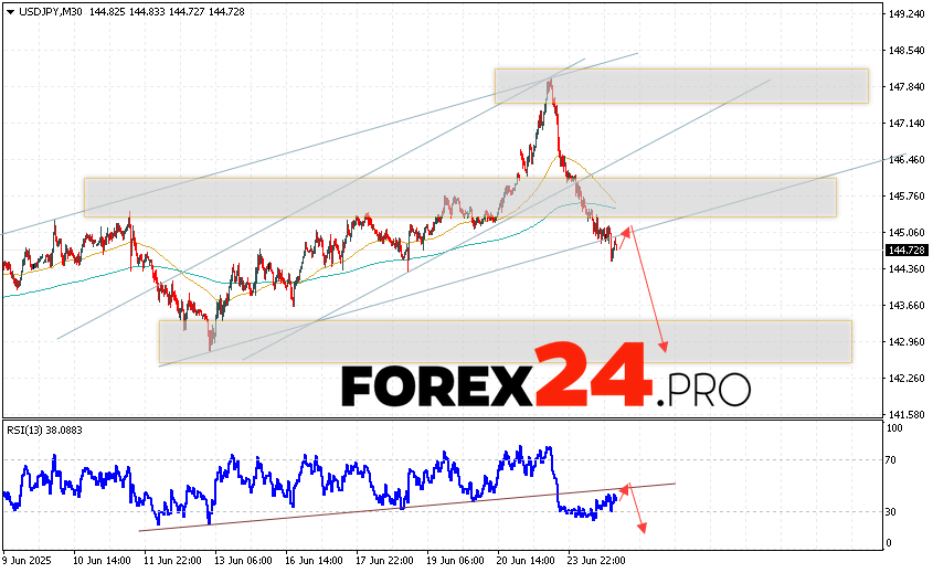 USDJ/PY Forecast Japanese Yen for June 25, 2025 suggests an attempt at a bullish correction with a test of the resistance zone near the 145.05 level. Then, the bearish momentum of the quotes will continue to develop in the area below the 142.65 mark. A test of the trend line on the relative strength indicator will support the pair’s decline. A strong rise in quotes and a breakout of the 145.85 area will cancel the decline scenario. This will indicate a breakout of the resistance level and a continuation of the pair’s growth with a potential target above the 148.45 level.