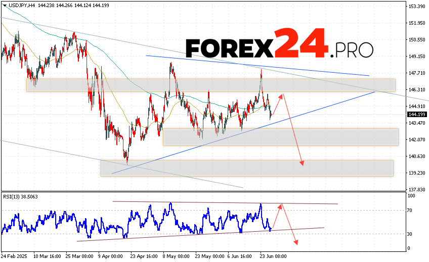 USD/JPY Forecast Japanese Yen for June 27, 2025 suggests an attempt to develop a bullish correction with a test of the resistance zone near the 145.35 level. Then, the bearish momentum of quotes will continue to develop in the area below the 140.45 mark. A test of the trend line on the relative strength indicator will support the pair’s decline. A strong rise in quotes and a breakout of the 149.65 area will cancel the decline scenario. This will indicate a breakout of the resistance level and a continuation of the pair’s growth with a potential target above the 151.85 level.