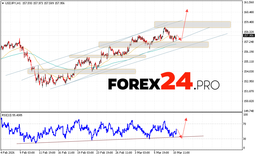 USD/JPY Forecast Japanese Yen for March 11, 2026 suggests an attempt to develop a bearish correction with a test of the support zone near 157.35. Then, the bullish momentum will continue to develop above 155.15. A test of the trend line on the RSI will support the pair’s growth. The upside scenario would be cancelled if prices fall and break below 156.65. This would indicate a breakout of the support level and a continued decline in the pair, with a potential target below 154.05.