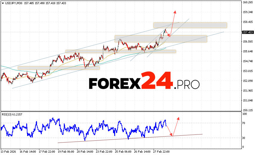 USD/JPY Forecast Japanese Yen for March 3, 2026 suggests an attempt at a bearish correction with a test of the support zone near 156.85. Then, the bullish momentum in quotes will continue to develop above 159.65. A test of the trendline on the relative strength indicator (RSI) will support the pair’s growth. A decline in quotes and a breakout of 155.85 will cancel out this upward trend. This will indicate a breakout of the support level and continued decline in the pair, with a potential target below 153.65.