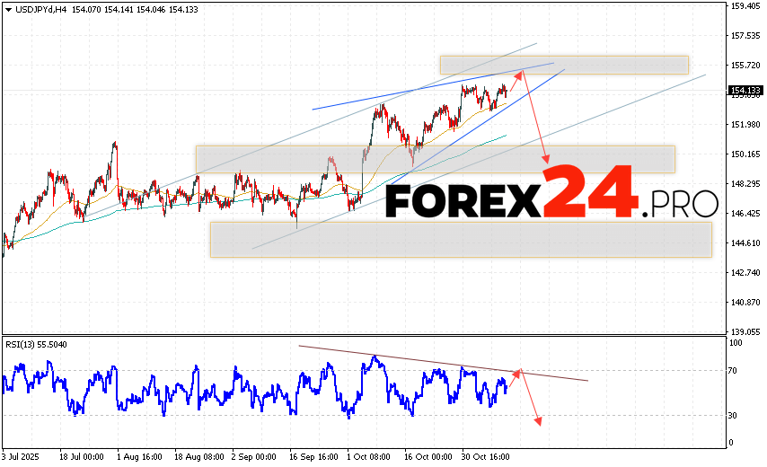 USD/JPY Forecast Japanese Yen for November 13, 2025 suggests an attempt at a bullish correction, testing the resistance zone near 154.85. Subsequently, the bearish momentum will continue to develop below 149.75. A test of the trendline on the relative strength indicator (RSI) would support a downside move. A strong rally and a breakout of 156.85 would invalidate this downside scenario. This would signal a breakout of the resistance level and continued growth with a potential target above 158.75.