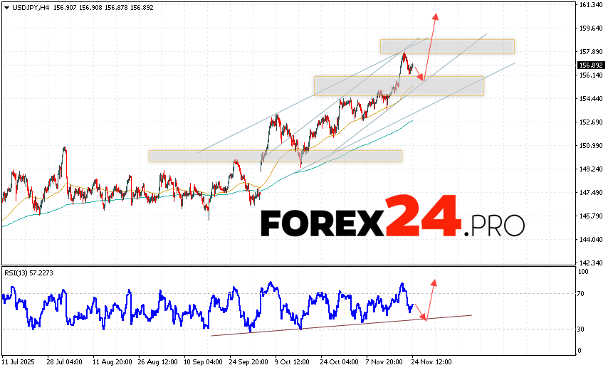 USD/JPY Forecast Japanese Yen for November 25, 2025 suggests an attempt to develop a bullish correction with a test of the support zone near 155.75. Then, the bullish momentum in quotes will continue to develop above 160.65. A test of the trendline on the relative strength indicator (RSI) will support the pair’s growth. A decline in quotes and a breakout of 154.05 will cancel out the upward trend. This will indicate a breakout of the support level and a continued decline in the pair, with a potential target below 152.25.