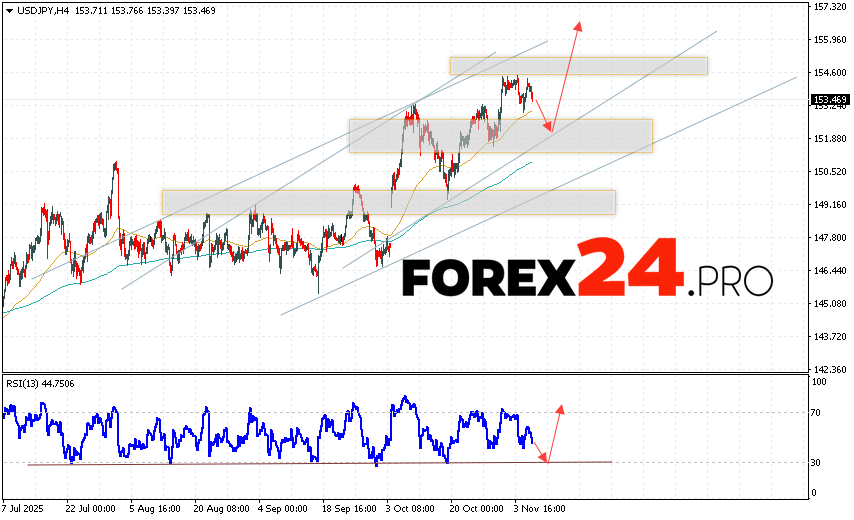 USD/JPY Forecast Japanese Yen for November 7, 2025 suggests an attempt at a bearish correction with a test of the support zone near 152.65. Then, the bullish momentum in quotes will continue to develop above 156.65. A test of the trendline on the relative strength indicator (RSI) will support the pair’s growth. A decline in quotes and a breakout of 151.35 will cancel out the upward trend. This will indicate a breakout of the support level and a continued decline in the pair, with a potential target below 148.45.