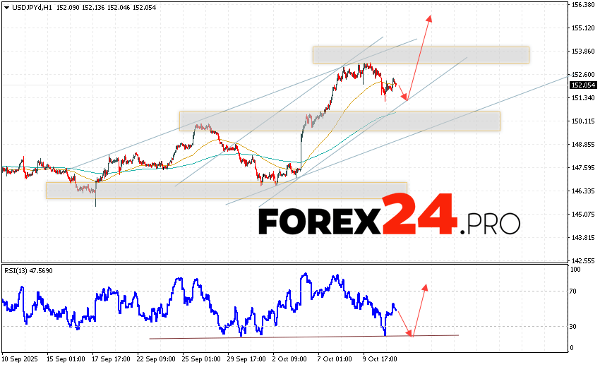 USD/JPY Forecast Japanese Yen for October 14, 2025 suggests an attempt at a bearish correction with a test of the support zone near 151.65. Then, the bullish momentum in quotes will continue to develop above 155.35. A test of the trendline on the relative strength indicator (RSI) will support the pair’s upside. A decline in quotes and a breakout of 150.45 will cancel out the upward trend. This will indicate a breakout of the support level and a continued decline in the pair, with a potential target below 148.65.