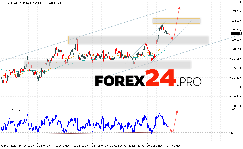 USD/JPY Forecast Japanese Yen for October 15, 2025 suggests an attempt at a bearish correction with a test of the support zone near 150.80. Then, the bullish momentum in quotes will continue to develop above 155.85. A test of the trendline on the relative strength indicator (RSI) will support the pair’s upside. A decline in quotes and a breakout of 150.05 will cancel out the upward trend. This will indicate a breakout of the support level and continued decline in the pair, with a potential target below 148.25.