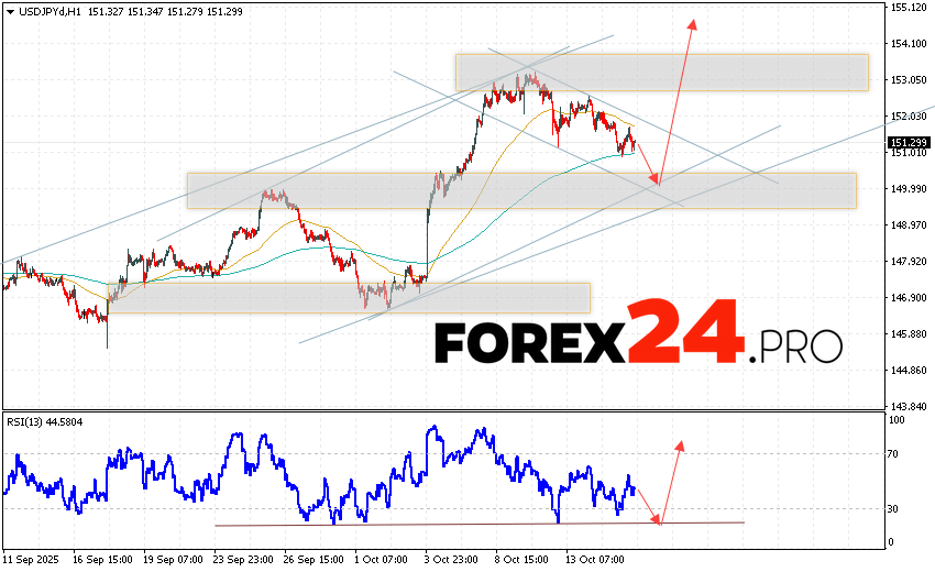 USD/JPY Forecast Japanese Yen for October 16, 2025suggests an attempt at a bearish correction with a test of the support zone near 150.05. Then, the bullish momentum in quotes will continue to develop above 154.65. A test of the trendline on the relative strength indicator (RSI) will support the pair’s upside. A decline in quotes and a breakout of 148.65 will cancel out the upward trend. This will indicate a breakout of the support level and continued decline in the pair, with a potential target below 146.35.