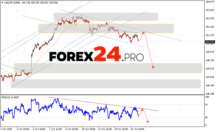 USD/JPY Forecast Japanese Yen for October 17, 2025 suggests an attempt at a bullish correction, testing the resistance zone near 151.25. Subsequently, the bearish momentum will continue to develop below 148.05. A test of the trendline on the relative strength indicator (RSI) would support a decline. A strong rally and a breakout of 151.75 would invalidate the bearish scenario. This would signal a breakout of the resistance level and continued growth with a potential target above 153.05.