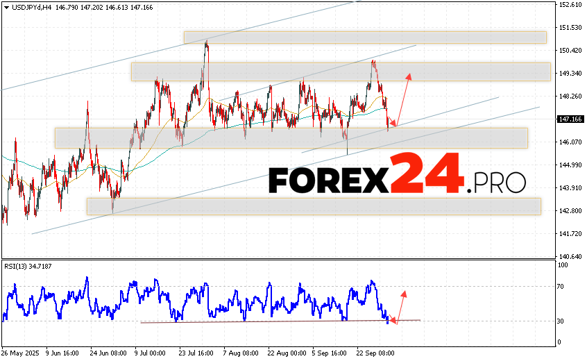 USDJPY Forecast Japanese Yen for October 2, 2025 suggests an attempt to develop a bearish correction with a test of the support zone near 146.85. Then, the bullish momentum in quotes will continue to develop above 149.35. A test of the trendline on the relative strength indicator (RSI) will support the pair’s growth. A decline in quotes and a breakout of 145.85 will cancel out the upward trend. This will indicate a breakout of the support level and a continued decline in the pair, with a potential target below 143.35.