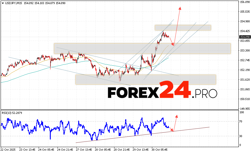 USD/JPY Forecast Japanese Yen for October 31, 2025 suggests an attempt at a bearish correction with a test of the support zone near 153.65. This should then lead to continued bullish momentum in quotes above 155.75. A test of the trendline on the relative strength indicator (RSI) would support the pair’s upside. A decline in quotes and a breakout of 152.35 would cancel out the upward trend. This would indicate a breakout of the support level and a continued decline in the pair with a potential target below 148.05.