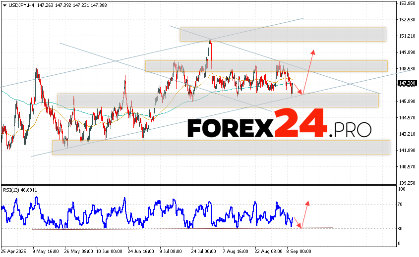 USDJPY Forecast Japanese Yen for September 10, 2025 suggests an attempt to develop a bearish correction with a test of the support zone near the level of 146.75. Then, the continuation of the development of the bullish impulse of quotes to the area above the mark of 149.85. The test of the trend line on the relative strength indicator will be in favor of the growth of the pair. The cancellation of the growth option will be a drop in quotes and a breakout of the 146.45 area. This will indicate a breakout of the support level and a continuation of the fall of the pair with a potential target below the level of 144.35.