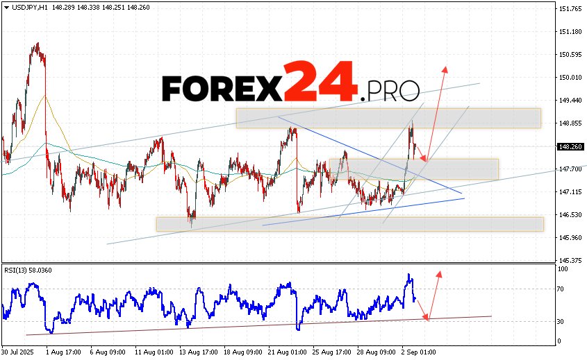 USD/JPY Forecast Japanese Yen for September 3, 2025 suggests an attempt to develop a bearish correction with a test of the support zone near the level of 147.45. Then, the continuation of the development of the bullish impulse of quotes to the area above the 150.35 mark. The test of the trend line on the relative strength indicator will be in favor of the growth of the pair. The cancellation of the growth option will be a drop in quotes and a breakout of the 147.45 area. This will indicate a breakout of the support level and a continuation of the fall of the pair with a potential target below the level of 145.65.