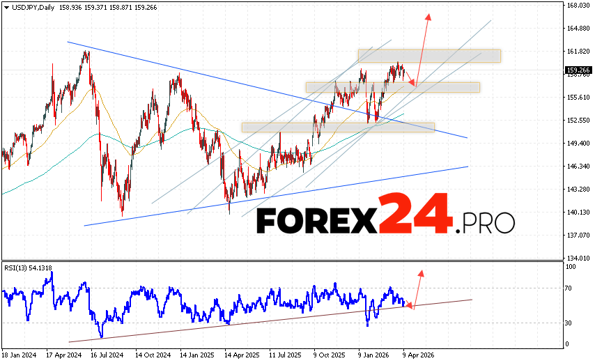 USD/JPY Weekly Forecast April 13 – 17, 2026 suggests an attempt at a bearish correction and a test of support near 156.05. From there, we should expect the pair to continue rising above 165.25. A test of the trendline on the relative strength indicator (RSI) would be an additional signal of growth. A decline and a break of 153.75 would cancel out the upside scenario. This would indicate continued decline with a potential target below 151.35.
