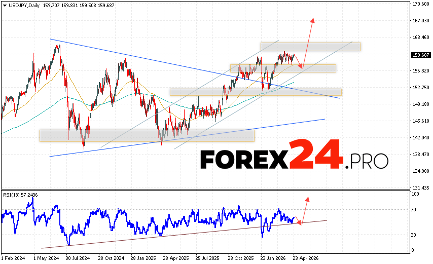 USD/JPY Weekly Forecast April 27 – May 1, 2026 suggests an attempt to develop a bearish correction and test the support level near the 156.45 area. Where can we expect the pair to continue to grow to the area above the level of 167.05. An additional signal in favor of growth will be a test of the trend line on the relative strength index (RSI). Cancellation of the option to raise the pair will be a fall and a breakdown of the level of 153.25. This will indicate a continuation of the pair’s fall with a potential target below the 150.45 area.