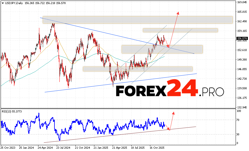 USD/JPY Weekly Forecast December 29, 2025 — January 2, 2026 suggests an attempt at a bearish correction and a test of support near 153.75. From there, we should expect continued growth above 165.75. A test of the trendline on the relative strength indicator (RSI) would be an additional signal of upside. A decline and a break of 151.55 would invalidate the pair’s upward trend. This would indicate continued decline with a potential target below 147.65.