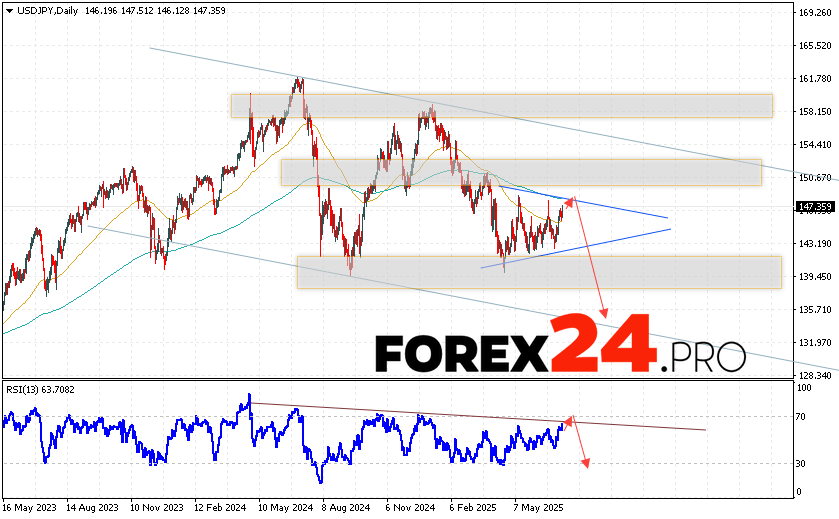 USD/JPY Weekly Forecast July 14 — 18, 2025 suggests an attempt at a bullish correction and a test of the resistance level near the 147.85 area. From there, we can expect the pair to continue falling to below the 135.45 level. An additional signal in favor of a decline will be a test of the trend line on the relative strength indicator. A strong rise and a breakout of the 150.45 level will cancel the decline scenario. This will indicate a continuation of the pair’s rise with a potential target above the 153.85 area.