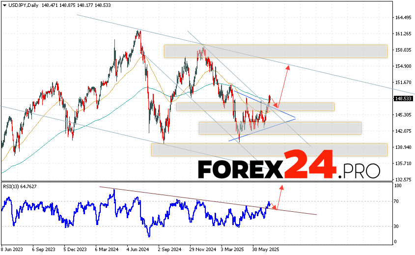 USD/JPY Weekly Forecast July 21 — 25, 2025 suggests an attempt at a bearish correction and a test of the support level near the 147.95 area. From there, we can expect the pair to continue growing to an area above the 154.95 level. An additional signal in favor of growth will be a test of the trend line on the relative strength indicator. A fall and breakout of the 141.65 level will cancel the option of the pair’s rise. This will indicate a continuation of the pair’s decline with a potential target below the 138.65 area.