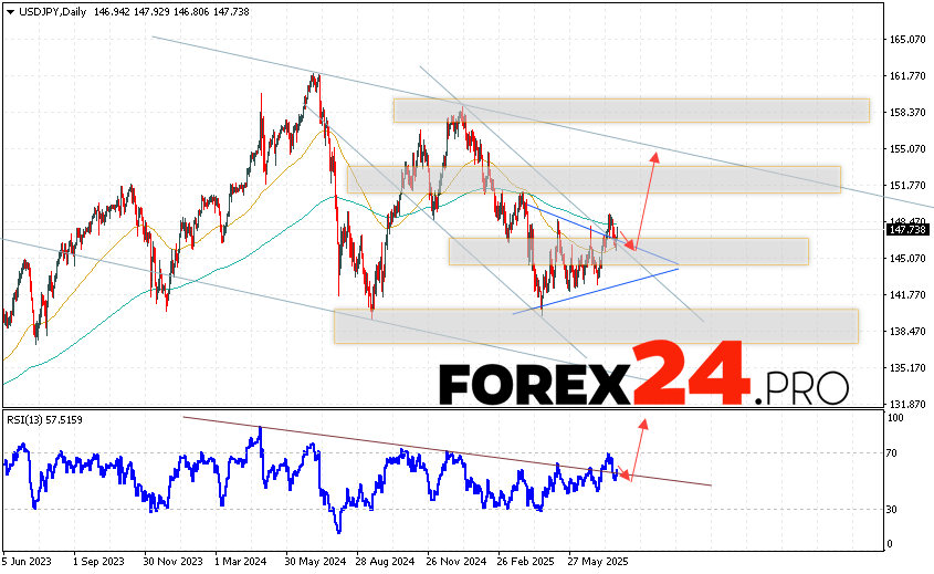 USD/JPY Weekly Forecast July 28 — August 1, 2025 suggests an attempt at a bearish correction and a test of the support level near the 146.45 area. From there, we can expect the pair to continue growing to an area above the 155.05 level. An additional signal in favor of growth will be a test of the trend line on the relative strength indicator. A fall and breakout of the 141.65 level will cancel the option of the pair’s rise. This will indicate a continuation of the pair’s decline with a potential target below the 138.35 area.