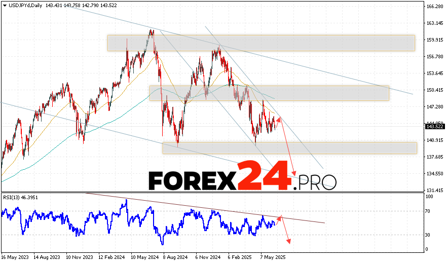 USD/JPY Weekly Forecast June 16 — 20, 2025 suggests an attempt at a bullish correction and a test of the resistance level near the 145.05 area. From there, we can expect the pair to continue falling to below the 134.65 level. An additional signal in favor of a decline will be a test of the trend line on the relative strength indicator. A strong rise and a breakout of the 147.55 level will cancel the decline scenario. This will indicate a continuation of the pair’s rise with a potential target above the 152.65 area.