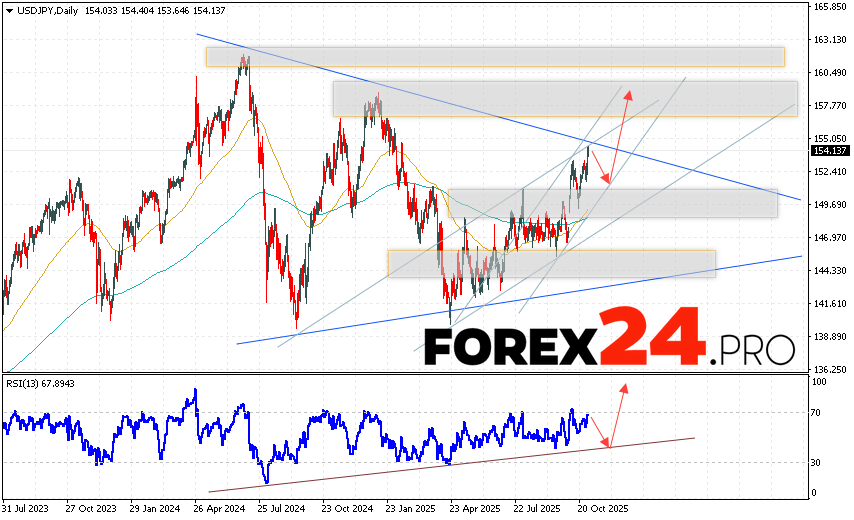 USD/JPY Weekly Forecast November 3 – 7, 2025 suggests an attempt to develop a bearish correction and a test of the support level near 152.05. From there, we should expect continued growth in the pair above 158.65. A test of the trendline on the relative strength indicator (RSI) will be an additional signal in favor of an upside move. A decline and a breakout of 149.05 would invalidate the pair’s upward trend. This would indicate continued decline, with a potential target below 142.45.