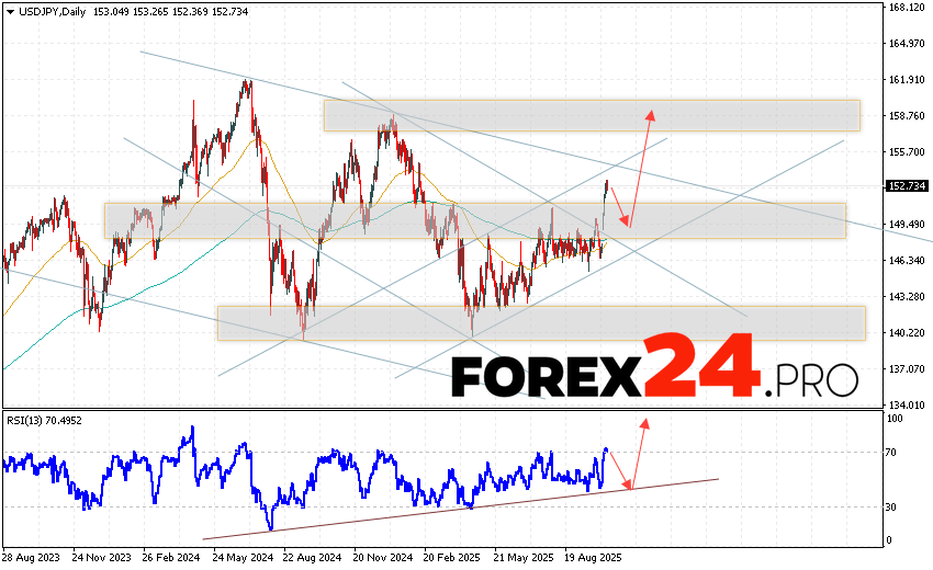 USDJPY Weekly Forecast October 13 – 17, 2025 suggests an attempt at a bearish correction and a test of support near 149.45. From there, we should expect the pair to continue rising above 158.75. A test of the trendline on the relative strength indicator (RSI) would be an additional signal of upside. A decline and a break of 145.05 would invalidate the pair’s upward trend. This would indicate continued decline with a potential target below 142.45.