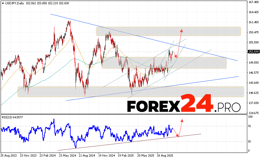 USD/JPY Weekly Forecast October 27 – 31, 2025 suggests an attempt at a bearish correction and a test of support near 150.65. From there, we should expect continued growth above 158.45. A test of the trendline on the relative strength indicator (RSI) would be an additional signal in favor of an upside move. A decline and a breakout of 149.25 would cancel out the upside potential. This will indicate a continuation of the pair’s decline with a potential target below the 143.65 area.