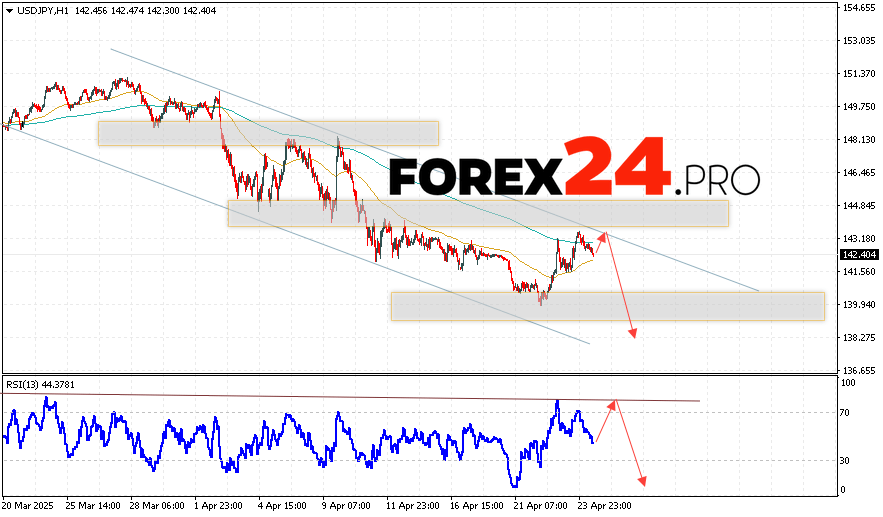 USD/JPY Forecast Japanese Yen for April 25, 2025 suggests an attempt to grow the price of the currency pair and test the resistance area near the 143.35 level. Then, the continuation of the development of the bearish impulse of quotes to the area below the 138.45 level. The pair’s growth will be supported by a test of the resistance line on the relative strength indicator. The cancellation of the fall option will be a strong growth and a breakout of the 144.65 area. This will indicate a breakout of the resistance level and continued growth for the pair with a potential target above the 147.85 level.
