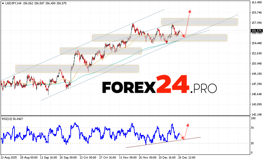 USDJPY Forecast Japanese Yen for December 29, 2025 suggests an attempt at a bearish correction with a test of the support zone near 155.65. Then, the bullish momentum in quotes will continue to develop above 159.85. A test of the trend line on the relative strength indicator (RSI) would support the pair’s upside. A decline in quotes and a breakout of 154.35 would cancel the upward trend. This would indicate a breakout of the support level and a continued decline in the pair, with a potential target below 151.65.
